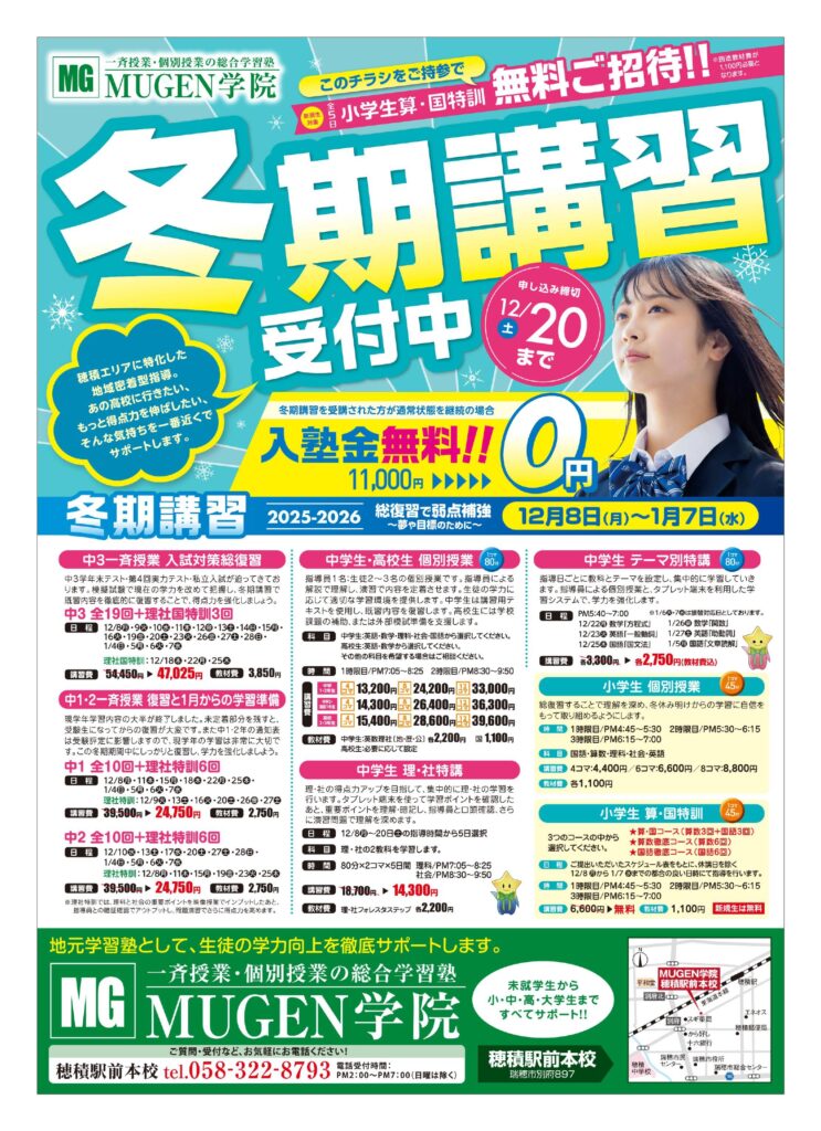 こんにちは!MUGEN学院穂積駅前本校の木村です。本日の新聞折り込みで、当塾の 冬期講習 チラシが折り込まれていたと思いますが、お手元の方には届いていらっしゃいますか?学校の冬休み期間だけだとできることが限られますので、来週12月8日(月)から来年1月7日(水)までを 冬期講習 と位置づけ、日程に余裕を持たせつつ、短期集中で行っていきたいと考えております。中学校では来年早々に実力テストも実施されますので、この冬の過ごし方がとても大切になります。得点力アップにぜひ当塾の 冬期講習 を活用していただければと考えております。講習の詳細に関しまして、ご質問やご相談がありましたら、お気軽にご連絡ください。