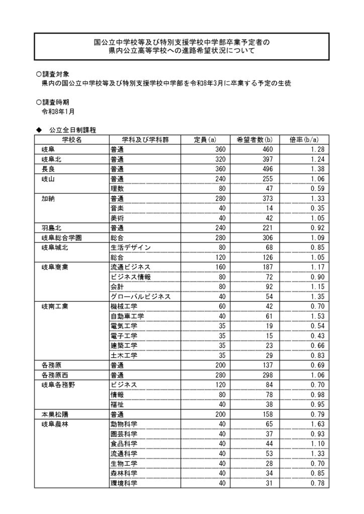 こんにちは!MUGEN学院穂積駅前本校の木村です。岐阜県教育委員会のホームページに 令和8年1月に県内の中学校で実施された 進路希望調査 の結果がアップされておりましたので、こちらのホームページ上にもアップしておきます。あくまで現時点での数字ですので、もちろんここから数字は変わると思われますが、大勢に関しては把握できるかと思います。詳細に関しましては、岐阜県教育委員会のホームページにてご確認ください。