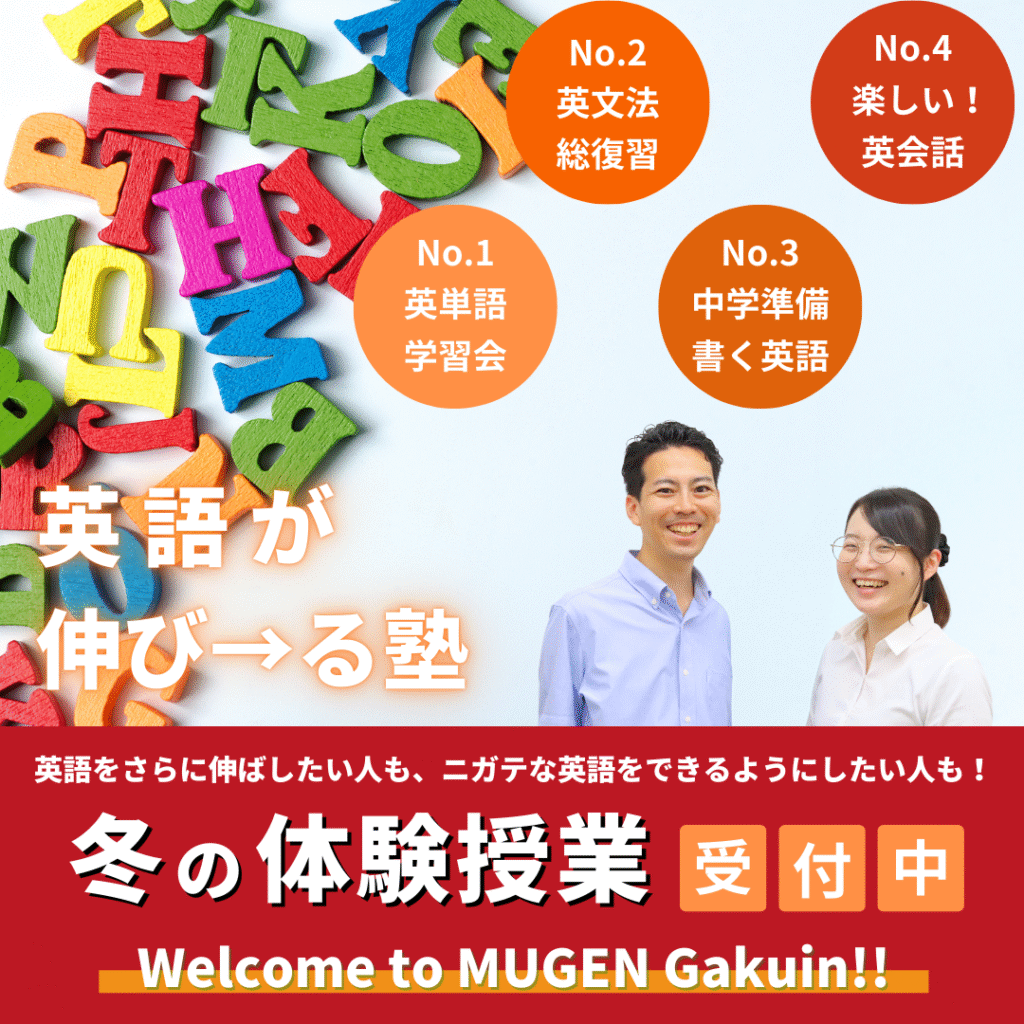 ひとこと:生徒の皆さんの今と未来を楽しくするために、いろんな情報を仕入れています!ご家庭とも学校とも違う第三者だからこその目線で、勉強だけでなく進路や今後の社会変化などを、調べたり考えたりしてお伝えしています。ただ学ぶだけではない塾、MUGEN学院に是非一度お声がけくださいね!